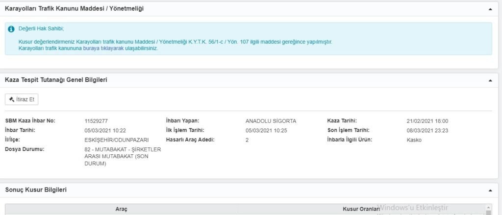 Kazaya karışan taraflar belirlenen kusur oranlarını, http://www.sbm.org.tr adresindeki “Hizmetler”  Menüsü altında “Kaza Tespit Tutanağı Sorgulama ve İtiraz” adımından öğrenebilirler. Sigorta Şirketleri arasında anlaşma ile sonuçlanan kusur miktarlarına itiraz etmek isteyen taraf, 5 gün içerisinde elinde bulunan yeni bilgi ve belgeler ile sigorta şirketine başvurabilmektedir. Dolayısıyla haklılığını ispat etmek için kaza sırasında ki ayrıntılı fotoğraf ve video çekimleri çok büyük önem arzetmektedir. 5 günlük süre içinde itiraz hakkının kullanılmadığı veya itiraz hakkı kullanılmış olup talebin karşılanmadığının değerlendirildiği durumlarda, sigortalıların kusur oranına ilişkin itirazlarının Tahkim Komisyonu ve özel hukuk yollarına başvurulmak suretiyle çözülmesi gerekmektedir. Ayrıca ifade etmek gerekir ki kazaya karışan araçların sigorta şirketlerinin aynı olması halinde belirlenen kusur oranına http://www.sbm.org.tr adresindeki “Hizmetler” Menüsü altında “Kaza Tespit Tutanağı Sorgulama ve İtiraz ” bölümünde  5 iş günü içerisinde itiraz edilebilmekte ve tutanağın Kaza Kusur Değerlendirme Komisyonu tarafından değerlendirilmesi sağlanabilmektedir. Ancak kazaya karışan araçların  sigorta şirketlerinin farklı olması halinde yukarıda da ifade edildiği üzere sigortalı itirazını kendi sigorta şirketine yapmaktadır. Bu takdirde SBM uygulaması üzerinden bir itiraz yapılamayacaktır.